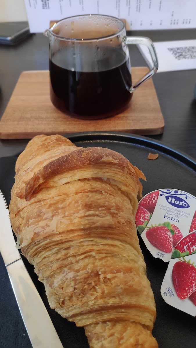Alongside these fantastic drinks, the menu boasts some tempting breakfast items that pair wonderfully with your coffee of choice. The classic croissant with jam is a must-try, offering a flaky, buttery texture complemented by a sweet spread of jam. For those who enjoy a simpler yet equally satisfying treat, the croissant with butter and jam provides the ideal balance of flavors. And if you have a sweet tooth, don't miss out on their hot chocolate, which makes for a comforting indulgence any time of day.